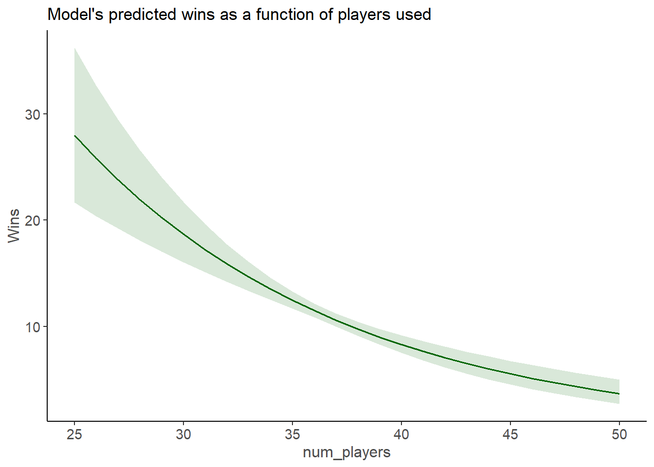 Here we can see that - generally speaking - teams that use 30 players during the season can expect to win about 16-21 games. While those that swap out the magnets 45 times tend to win just over five. But its also worth knowing that the relationship is curved, showing the exponentially greater wins for those teams that aren’t changing things around.