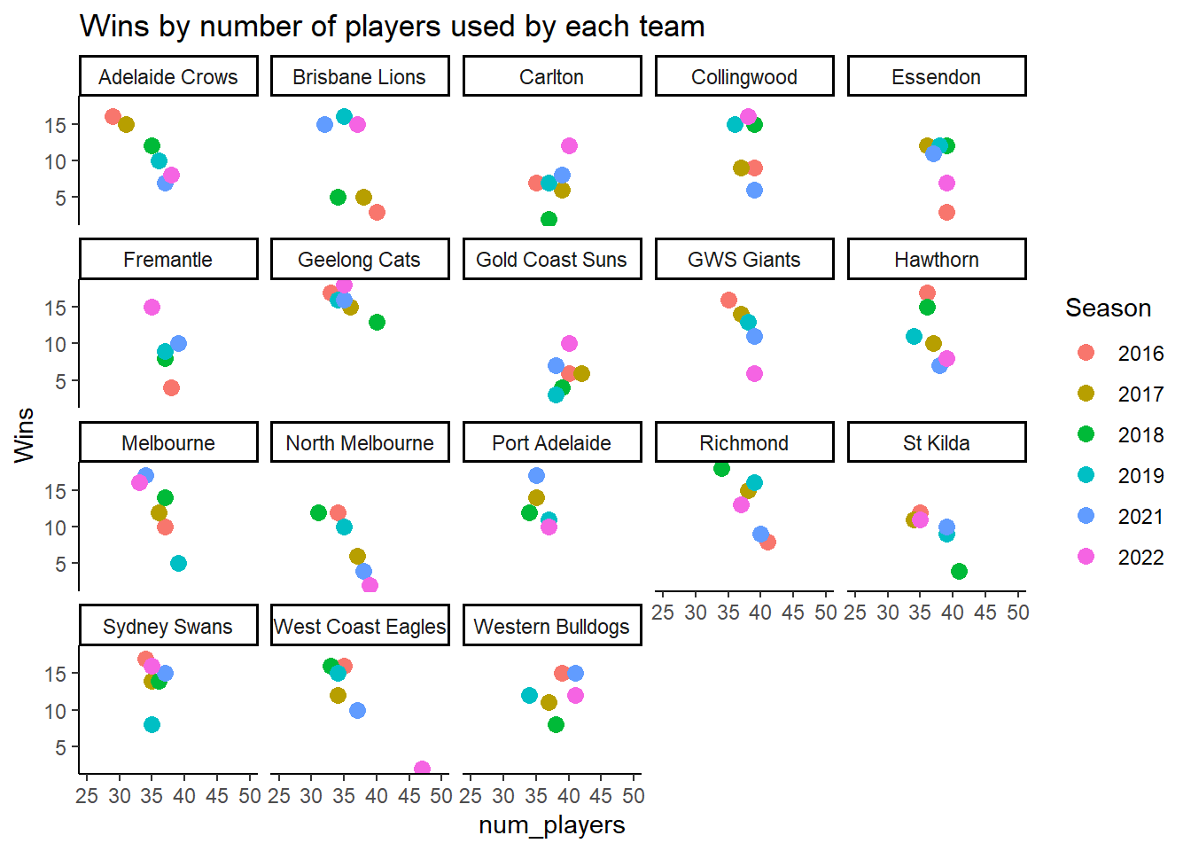 Here we can see some interesting things. My own team, Melbourne made quite a few changes in 2019 and by 2021 of course, they won a flag - a year where things were incredibly stable. The West Coast Eagles have slipped from a team that had quite a lot of success until 2022 when they performed badly and made plenty of changes. North Melbourne not had the luxury of stability and their performance progressively suffered.